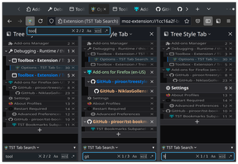 تبحث TST Tab Search هو ملحق لمتصفح فايرفوكس مصمم لتعزيز تجربة علامات التبويب بأسلوب الشجرة (TST) من خلال توفير وظيفة بحث قوية. مع هذه الأداة، يمكن للمستخدمين بسرعة تحديد مواقع علامات التبويب المفتوحة في النافذة الحالية باستخدام مربع بحث مخصص مدمج في الشريط الجانبي لـ TST. يتميز بمفتاح اختصار البحث العالمي (Ctrl+Shift+F) للوصول السهل، ومرشحات بحث قابلة للتخصيص، والقدرة على التنقل بين النتائج للتبديل مباشرة إلى علامات التبويب. يمكن للمستخدمين إجراء عمليات بحث حساسة لحالة الأحرف، ومطابقات الكلمات الكاملة، وحتى استخدام التعبيرات العادية للعثور على علامات تبويب معينة.